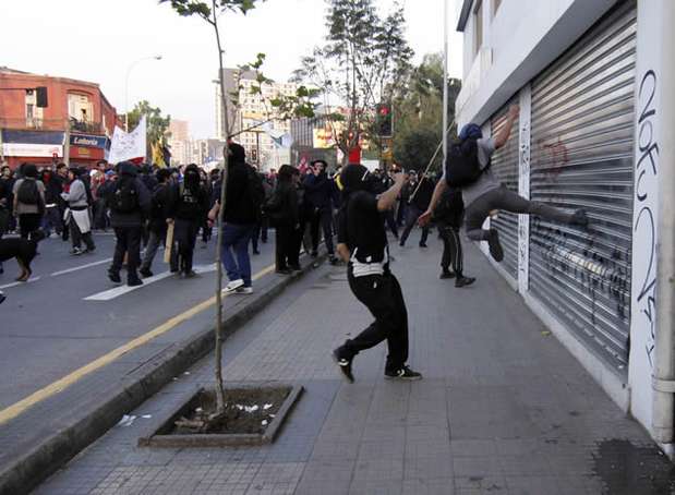 Fue en la intersección de Bustamante con Irarrázaval que decenas de encapuchadxs tomaron la iniciativa y comenzaron a arrancar señaleticas, bancas y rejas para cortar la calle, a la vez que otrxs lanzaban piedras, bombas de pintura y también algunas molotov contra FFEE de la policía. En la misma esquina, algunxs compañerxs comenzaron a atacar un banco BCI, tratando de reventar sus cortinas metalicas e incluso intentando prenderle fuego.
