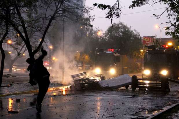 La policía intento dispersar a lxs capuchas con carros lanza agua y lanza gases, bombas lacrimógenas y pistolas de paintball. Por el costado del Parque las barricadas seguian aumentando, logrando en momentos frenar el avance policial. Luego los enfrentamientos se comenzaron a generar en avenida Matta con Bustamente.