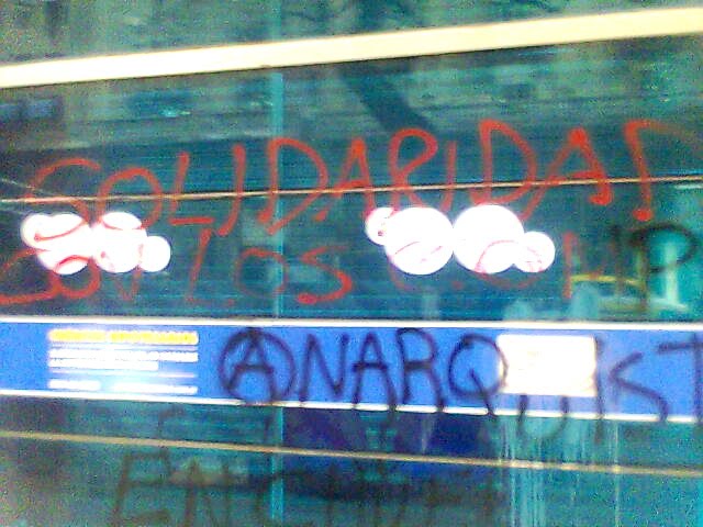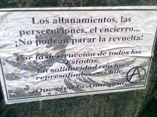 Entendiendo los allanamientos y detenciones a lxs compañerxs anarquistas en la region chilena, el dia viernes, como una consecuencia esperable por su participacion activa en la guerra social, y deseando saludarles aun ahora que se encuentran nuevamente en las calles, el dia lunes 14 de diciembre varixs anarquistas se acercaron hasta las puertas del consulado chileno de Buenos Aires, encontrandolas abiertas, por lo que se procedio a pintar el interior del mismo, asi como la fachada y la zona aledaña, con escritos recordando al compañero Mauricio Morales, saludando la fuga insurrecta de Diego Rios y por la libertad de lxs compañerxs presxs (Pablo, Matias, Cristian…)