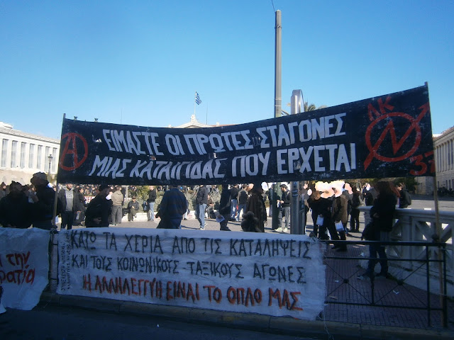 El despliegue policial era a su vez enorme, con muchísimos escuadrones de antidisturbios localizados en todo el centro de la ciudad, además de fuerzas motorizadas y un helicóptero de vigilancia. Desde la intersección de las calles Panepistimiou y Patision la policía que, hasta entonces, seguía la manifestación por la calle paralela, acordonó a la gente por ambos lados. Hubo varios momentos de tensión e incluso uso de gases químicos en dos ocasiones, pero nada más.